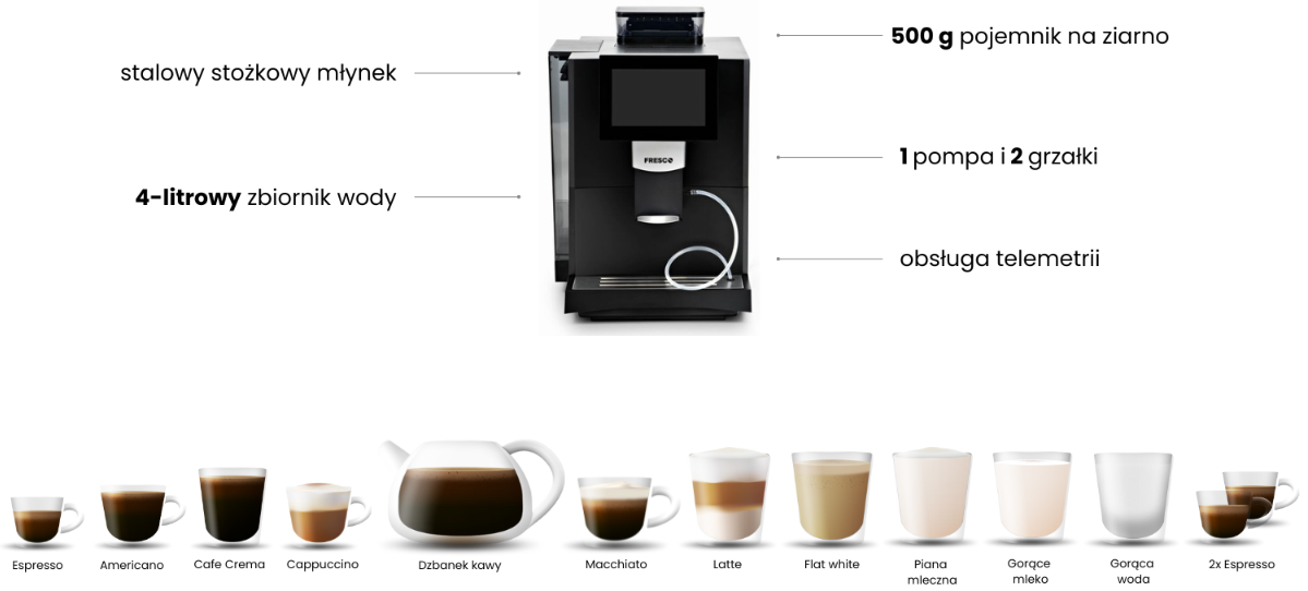 Ekspres automatyczny do kawy Fresco X65 to urządzenie o kompaktowych rozmiarach i wydajności do 80 filiżanek kawy dziennie. Wyposażony w 4-litrowy zbiornik na wodę, 500g zasobnik na ziarna i moduł 2 wydajnych termobloków sprawdzi się doskonale w przestrzeniach biurowych czy mniejszym lokalu gastronomicznym. Urządzenie posiada prosty w obsłudze 7-calowy wyświetlacz, na którym można zamieścić krótkie filmy reklamowe.